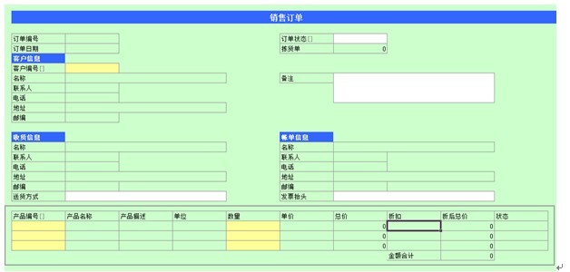 用户可以通过新建“销售订单表”来录入新订单,如下图所示。一个完整的销售订单包括订单编号(主键)、订单日期、客户信息、收货信息、账单信息、备注、订单状态,以及订单明细。
