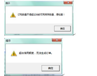 订单明细中的产品编号通过弹出列表选择,用户需手工输入订购数量,系统将自动计算总价和折扣。当订购数量超出当前可用库存,或者订购金额超出可用额度时,系统将分别提示如下。
