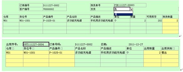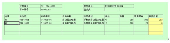 仓库使用拣货单作为拣货和发货的依据。拣货单包括订单号码、客户编号,该订单订购产品所在的货位号,以及对应货位的可用库存。当某一种产品需要在多个货位拣货时,用户可以采纳系统自动计算的拣货数量,也可以自己调整拣货数量。如下图所示,该订单订购210个充电器,需要从两个货位拣货才能满足数量要求,系统自动计算的结果为分别拣货202个和8个,用户也可以自己调整拣货数量。