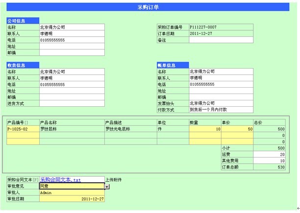 采购订单由采购申请人填写,订单编号和订单日期将自动生成,订单明细中的产品编号、数量、单价为必填项。如有必要,申请人可以在采购合同文本处上传采购合同文件。