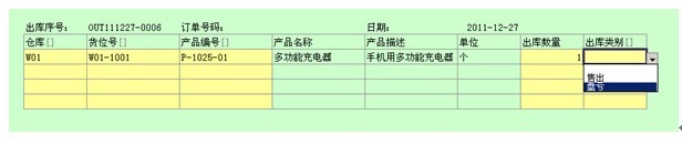 产品出库表除了用于记录销售订单销售的货物出库外,还可以用于库存盘亏时调整库存。如下图所示,出库单由出库序号、订单号码(通过订单售出时填写)、日期和出库明细组成。用户可以在出库类别字段通过下拉列表选择“售出”或者“盘亏”。