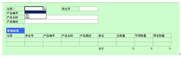 库存查询表为纯模板,不保存数据。用户可以使用该模板,根据仓库、货位号、产品编号、名称、描述查询当前库存,支持模糊查询。