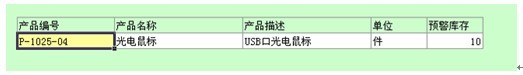 产品表用于存放用户所在单位要销售的所有产品的基础信息,包括产品编号、名称、描述、计量单位,以及触发预警的最低库存。产品编号为本表的主键。