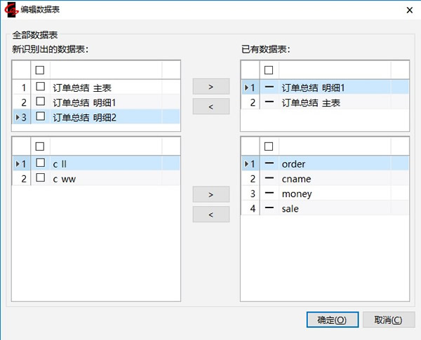 4.将新增加的“订单总结¬—明细表2”数据表及数据项添加到右侧“已有数据表”中。点击【确定】。